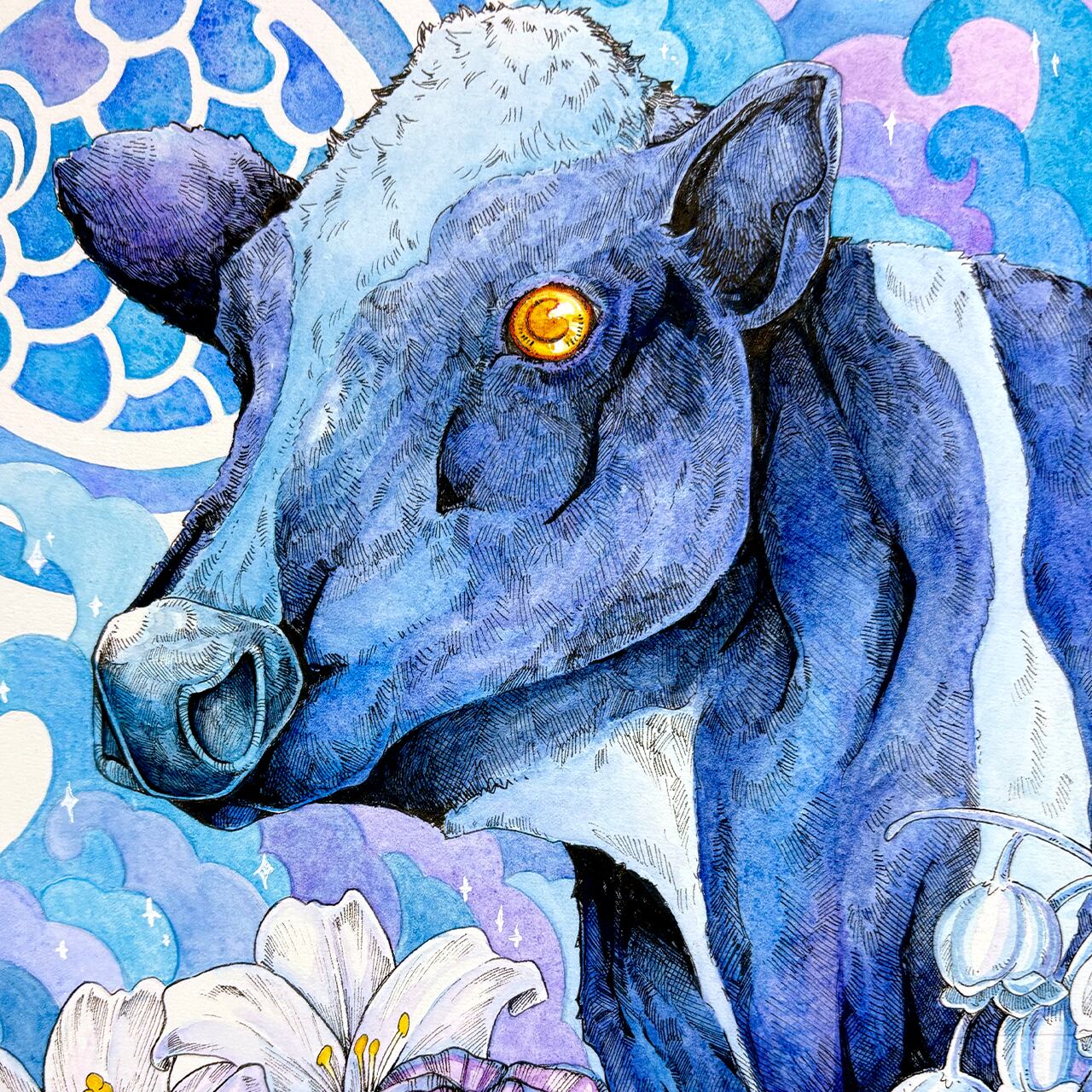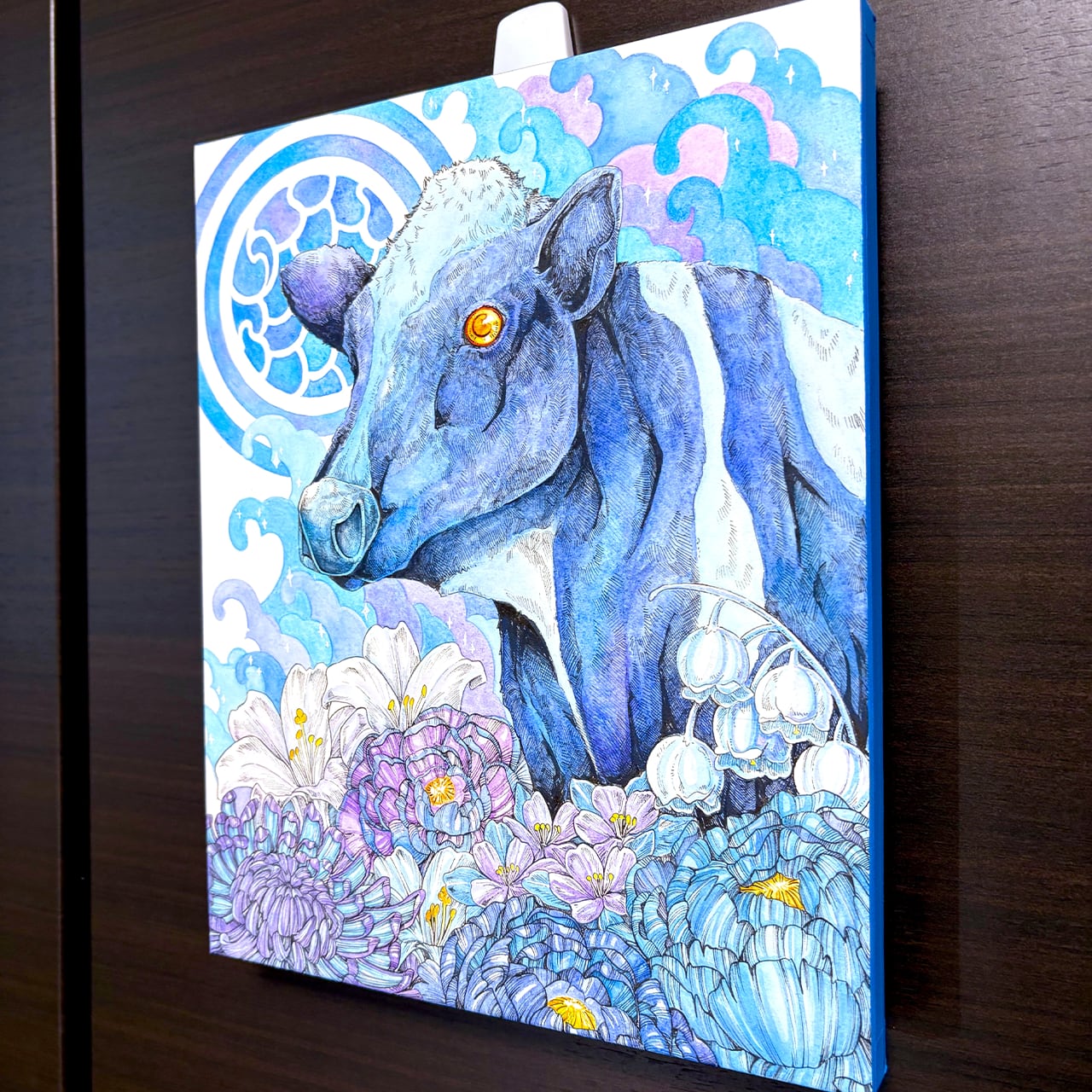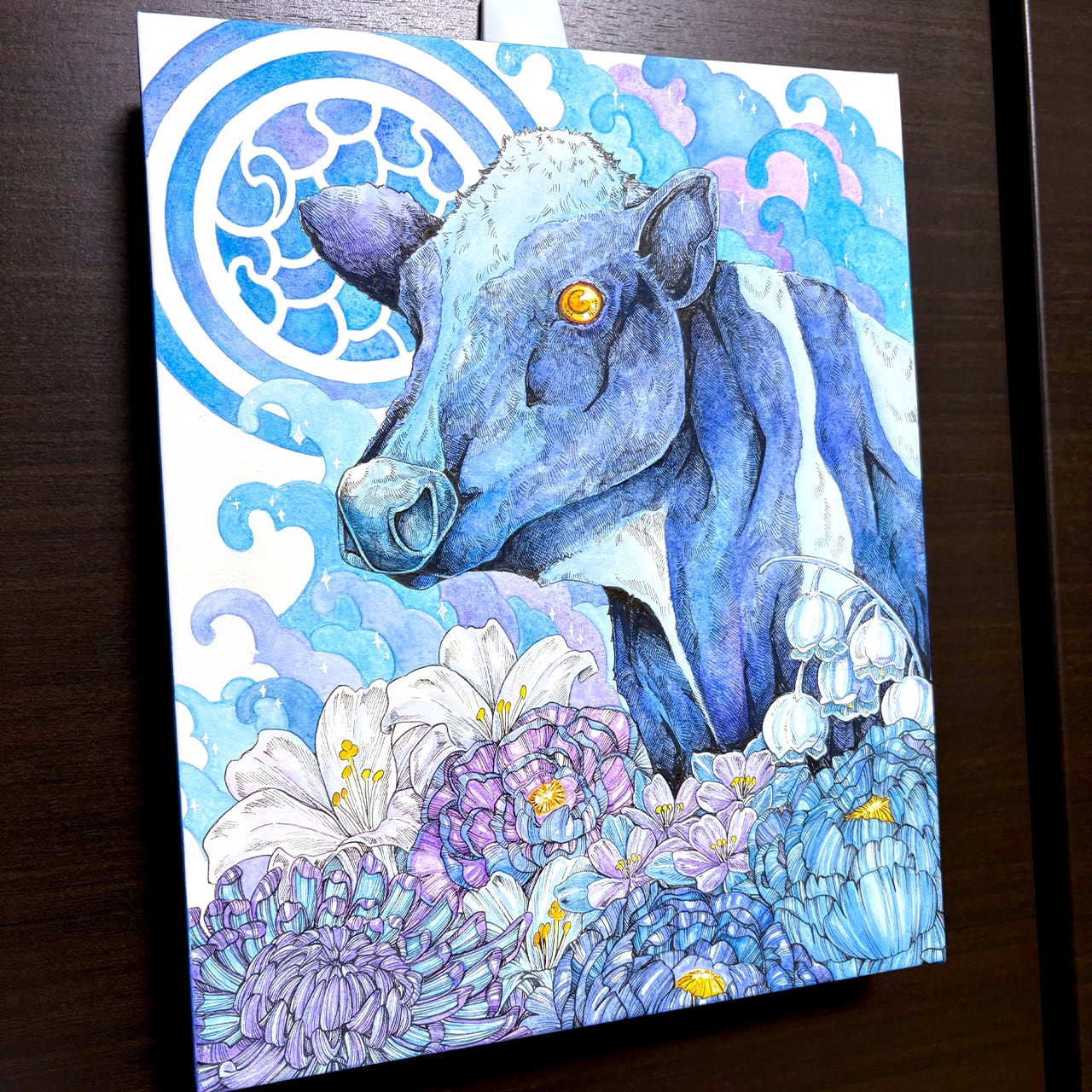 画材:木製パネル、透明水彩絵の具、アクリル絵の具、ペン
